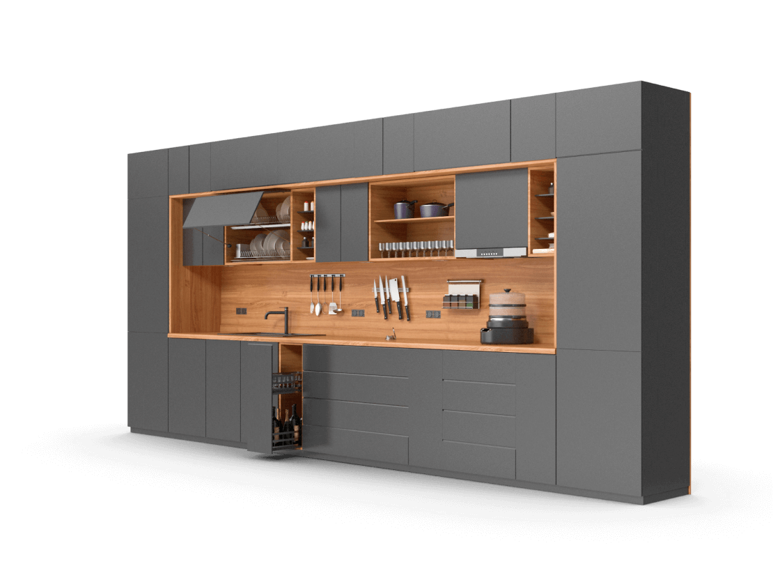 Однако на практике, чаще всего кухню заказывают в то время, когда ремонт еще не закончен. Такой вариант тоже возможен, только в этом случае необходимо четко следовать рекомендациям дизайнера: расположить розетки, уровень фартука и потолка строго по проекту, так как размеры кухонного гарнитура четко вписываются в подготовленную комнату.